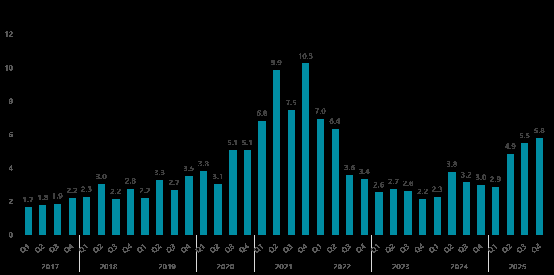 ואם בשינוי סדרי עולם עסקינן, אז אחד הדברים הכי בטוחים בעולם הכלכלי הוא החלטות ריבית. כללי המשחק בנושא הזה ידועים. סמוך למועד החלטת הריבית, הבנקים המרכזיים "משדרים" לשווקים על כוונתם ואלו מבצעים את התמחור בהתאם לכך. נדירים המקרים שבהם "כללי המשחק" הללו מופרים. הם עוד יותר נדירים כאשר הם קורים לבנק מרכזי שידוע באופיו השמרני כמו בנק ישראל. אבל בשבוע שעבר הבלתי צפוי קרה כאשר בנק ישראל הפגין גמישות מפתיעה והפחית את הריבית בניגוד מוחלט לציפיות בפעם השנייה ברציפות. מעבר לעצם ההפחתה, ההפתעה הייתה גם בסגנון. אחרי תקופה ארוכה שבה הבנק שידר עמדה שמרנית ודי “ניצית”, הוא הפגין פתאום גמישות שניסתה אולי לרמוז על כך שכל האופציות פתוחות בהחלטות הריבית הבאות. הבנק נימק את המהלך בשלושה גורמים: התמתנות סביבת האינפלציה, התחזקות השקל והקלה במגבלות ההיצע.  בתוך ההודעה עצמה, “אותו טקסט” כמעט היה יכול להצדיק גם אי-הפחתה. בנוסף לכך, גם תחזית המקרו הרבעונית התעדכנה באופן די מינורי, מה שמוביל לכך שהטריגר להפחתת הריבית הגיע ממקום אחר, שוק המט״ח. בתהליך ארוך אך עקבי, המשיך השקל את המגמה שאיפיינה אותו בשנים האחרונות והוא הוסיף להתחזק את מול הדולר וסל המטבעות. ההיחלשות של השקל נובעת מכמה גורמים. הראשון, ירידה חדה בפרמיית הסיכון לרמה אשר קרובה לרמה שהיתה טרום המלחמה. הגורם השני הוא זרימת המטבע לתוך ישראל. כפי שניתן לראות בגרף שמצורף למטה, היקף גיוסי ההון של חברות ההיי טק נמצאים ברמתם הגבוהה ביותר אי פעם למעט התקופה שלאחר הקורונה.