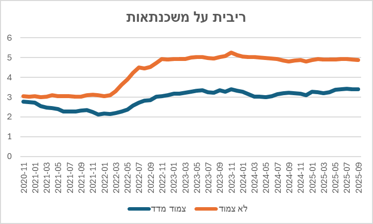 מאז שהוכרזה הפסקת האש בתחילת החודש, רשם סקטור חברות הבניה את התשואה הגבוהה ביותר מבין כל הענפים לאחר שעלה בכ 20%. העלייה החדה (עדיין בתשואת חסר מתחילת השנה לעומת תל אביב 125) נבעה מכך שהמשקיעים הניחו שהרגיעה הביטחונית תשפר את תחושת הביטחון של הצרכנים, מה שיניע את רוכשי הדירות הפוטנציאליים לממש את שאיפתם לרכוש דירה לאחר הקיפאון בשוק בחודשים האחרונים. אלא שנראה שהשיקול הביטחוני הוא דווקא השולי מבין יתר השיקולים שמנחים את רוכשי הדירות. בכנס שנערך בשבוע שעבר בנושא הנדל"ן הציגה גלית בן נאים, סגנית בכירה לכלכלן הראשי במשרד האוצר בתחום הנדל"ן, תמונה מפוכחת של שוק הדיור הישראלי. בשנתיים שחלפו מתחילת תקופת הקורונה ועד 2022 עלו מחירי הדירות בכ 40%. אלא שאז הריבית עלתה בחדות והשוק שרתח והציג את עליית המחירים החדה ביותר מבין מדינות OECD, עבר השוק למגמה של ירידה בעסקאות וירידות מחירים בפועל שהתעצמו עם פרוץ המלחמה. עליית הריבית ציננה את הביקושים והקטינה את הכדאיות ברכישת דירות להשקעה, כאשר עלויות המימון עולות על התשואות משכר הדירה. בן נאים הדגישה כי כל עוד הריבית תישאר גבוהה, לא צפויה חזרה לעליות מחירים. בנוסף, היא מטילה ספק לגבי תחזיות על גל עלייה משמעותי שיחזק את הביקוש, ומציינת כי בשנה האחרונה דווקא נרשמה הגירה שלילית. גם הורדת ריבית, לדבריה, לא תשנה את התמונה במהירות  מאחר והשכר במשק לא עלה בשיעור שמאפשר לרוב משקי הבית להתמודד עם מחירי הדיור הגבוהים. בהקשר של הריבית, יש לבחון את הנושא בפרספקטיבה רחבה יותר. הגרף שמצורף למטה מתאר את הריבית הצמודה והלא צמודה על המשכנתאות מ 2020. לאחר שזו נפלה עם פרוץ הקורונה, היא חזרה לעלות שנתיים לאחר מכן ומאז היא נמצאת באותה רמה. הציפייה של המשקיעים היא שבנק ישראל יפחית את הריבית, מה שיחלץ את הענף מהמשבר בו שרוי.