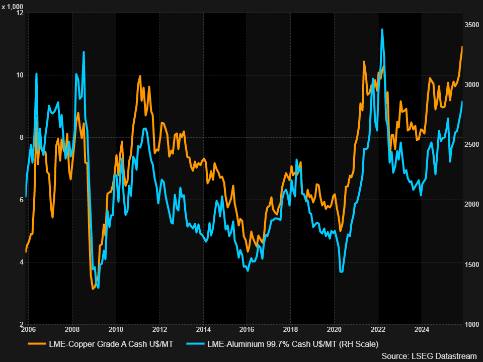 כפי שניתן לראות בגרף שמצורף למעלה, הביקוש הגובר לסחורות התעשייתיות (במקרה הזה, נחושת ואלומיניום) בא לידי ביטוי גם במחיריהם בחודשים האחרונים. מחיר הנחושת בעולם עלה בלמעלה מ 10% בשלושת החודשים האחרונים וב 24% מתחילת השנה, קרוב מאוד לרמות שיא היסטוריות. העלייה במחירי האלומיניום אמנם מתונה יותר מזו של הנחושת, אבל הכיוון דומה. הגידול בביקושים מגיע גם מתחומים “קלאסיים” כמו רכב ובנייה וגם מתוספת הקיבולת במרכזי נתונים ותשתיות אנרגיה. בעוד שמחירי האלומיניום בעולם עולים, הרי שבארה״ב הם עולים אף יותר בשל הטלת המכסים על היבוא מקנדה שהיא ספקית האלומיניום הגדולה לארה"ב כך שמחיר הקנייה בפועל לצרכן האמריקאי גבוה משמעותית ממחיר האלומיניום שנסחר בבורסות הסחורות.