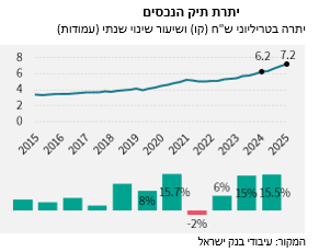הראשון הוא יתרת הנכסים של הציבור הישראלי שזינקה ב 2025 ב 15.5% והגיעה ל 7.2 טריליון ש"ח בעיקר בזכות העלייה בשוק המניות המקומי. העלייה בשווי תיק הנכסים של הישראלי הממוצע יוצרת תחושת יציבות כלכלית שבאה לידי ביטוי בין השאר בחזרה מהירה לדפוסי צריכה שהיו טרום המלחמה ואיפשרו למשק לצמוח על אף הסיטואציה הקשה והמורכבת.
