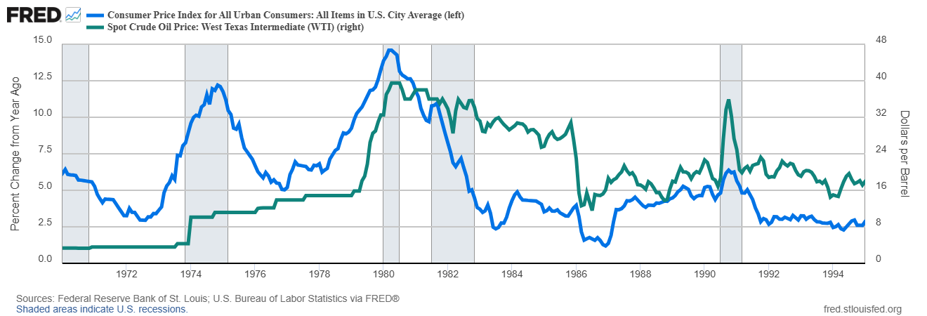 הגורם הראשון הוא העלות הכלכלית של המלחמה שנגזרת מהזינוק במחירי האנרגיה. הסיכון המרכזי טמון באפשרות של הסלמה שתפגע באספקת האנרגיה מהמפרץ הפרסי. האזור מחזיק כ- 48% ממאגרי הנפט המוכחים בעולם ומייצר כ- 31% מתפוקת הנפט העולמית. מעבר לכך, כ 20% מהנפט העולמי עובר דרך מצר הורמוז, אחד מצווארי הבקבוק החשובים ביותר במערכת האנרגיה העולמית. כל פגיעה בתנועה במעבר זה עלולה להוביל לזינוק חד במחירי האנרגיה ולזעזוע כלכלי גלובלי. לצד זה, יש לזכור שההשפעה של עלייה במחירי האנרגיה על האינפלציה ועל שרשרת האספקה של התעשייה כיום היא נמוכה בהרבה מכפי שהייתה בעבר. הגרף שמצורף למטה מתאר את מחירי הנפט בהשוואה לאינפלציה בארה"ב בתקופה שבין 1970 ל 1995. שימו לב לזינוק באינפלציה בארה"ב ב 1973 כתוצאה מהאמברגו שהטילו מדינות ערב לאחר מלחמת יום הכיפורים ולהשפעה הדרמטית שהייתה לקפיצה החדה במחירי האנרגיה על האינפלציה ב 1980 לאחר המהפכה באירן ומלחמת אירן – עירק. מאז ההשפעה של עלייה במחירי האנרגיה על האינפלציה, היא ירדה באופן חד מאחר ועוצמת הנפט בתוצר האמריקאי Oil intensity of GDP ירדה בכ-70%. המשמעות היא שהכלכלה מסוגלת לייצר יותר תוצר עבור כל יחידת אנרגיה.