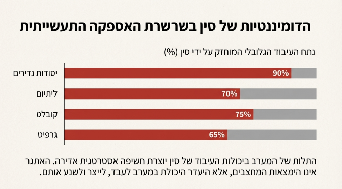 כדי להבין למה זה הופך לצוואר הבקבוק של העשור, יש לבחון את המשאבים שנדרשים כדי לאפשר את השימוש והפיתוח של הבינה המלאכותית. דאטה־סנטרים הם מפעלים של חשמל וקירור. לפי סוכנות האנרגיה הבינלאומי (IEA), צריכת החשמל של דאטה־סנטרים צפויה יותר מלהכפיל את עצמה עד 2030. בארה״ב דאטה־סנטרים צפויים להסביר כמעט מחצית מצמיחת הביקוש לחשמל עד 2030. המשמעות היא שבכל פעם שמדברים על “עוד שכבת מודלים”, בפועל מדברים על תוספת של עוד שכבת כבלים, שנאים, לוחות חשמל, מערכות קירור ומים. כאשר מערכת כזו גדלה כל כך מהר, היא לא נתקעת במחסור בנחושת בלבד, היא נתקעת ביכולת העיבוד ובקצב אספקת הציוד הכבד שמחבר בין החשמל לבין החישוב. הנקודה הזו מסבירה למה נחושת הפכה שוב למדד הסנטימנט של הכלכלה הפיזית. העלייה החדה במחיר הנחושת (כמו גם במתכות תעשייתיות אחרות) הן עדות לכך שהשוק מתמחר את עלות ההרחבה של רשתות, תחבורה חשמלית ודאטה־סנטרים. אלא שכאן מגיע אחד האלמנטים הכי חשובים אשר ממחישים שהבעיה היא לא רק בסחורה, אלא בקיבולת התעשייתית. לשם דוגמה, זמני אספקה ממוצעים של שנאים לגנרטורי ענק הגיעו ברבעון השני ל 143 שבועות, לא רק בגלל הביקוש הגובר, אלא גם בגלל שבתוך ארה"ב אין די יכולת ייצור של שנאים. לפי מקנזי, זה מסביר מדוע חיבורים לרשת מתארכים, פרויקטים נדחים, ולמה חברות ענק מוכנות לחתום על חוזי חשמל ארוכי טווח. כל זה יוצר חשש שמגבלות תשתית וזמינות הופכות לבעייה אסטרטגית. הגרף המצורף ממחיש את הבעיה. האתגר אינו הימצאות מחצבים נדירים, אלא העדר היכולת לייצר, לעבד ולשלח אותם. הגרף מתאר את הדומיננטיות של של סין בשלבים שונים של הייצור והעיבוד של כמה סחורות חיוניות.